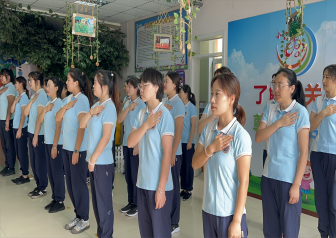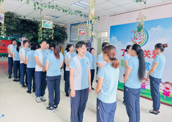 新的一天,新的开始,园所每天都会组织老师们召开晨会。用热情的服务和甜美的微笑迎接新的一天。大家面对面站好,整理仪容仪表。检查对面的同事,着装是否整洁,头发是否整齐,是否穿着园服,如果对方做的很好请给与她爱的拥抱,并赞美她(你真棒,谢谢你今天做出的改变)。